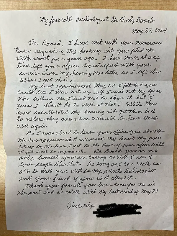 As I was about to leave your office you showed me compassion that warmed my heart. My pain let up by the time I got to the door of your office until I got back to my truck. Dr. Board you are not only honest you are caring as well, I see. I love people like that. As long as I can walk, as able to walk you will be my private Audiologist and your friend if you will allow it.